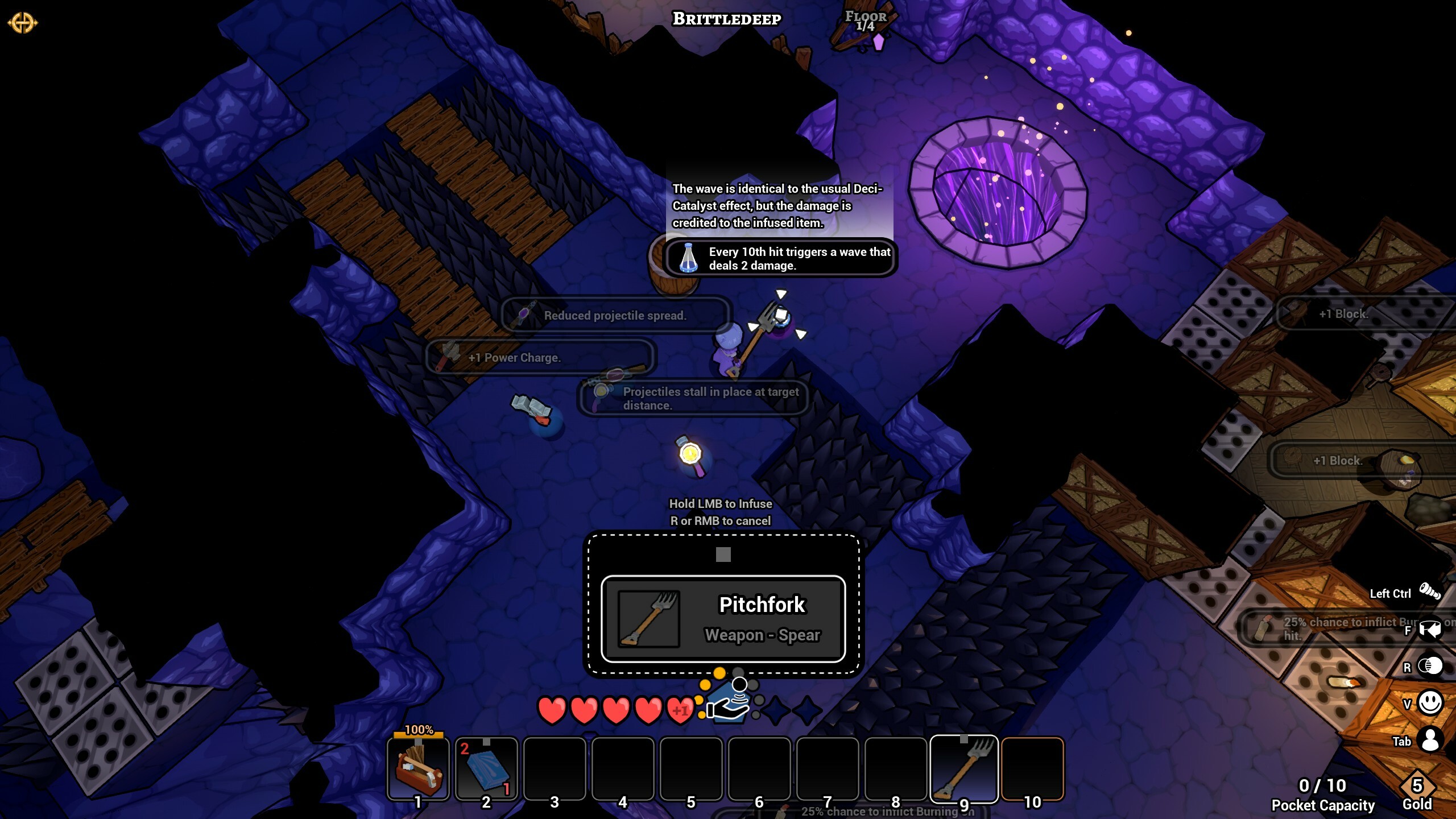 So far the results of the change have looked promising (mostly positive feedback from playtesters with a few valid complaints we're working to iron out), and a simpler system is easier to get into. Infusing is one of the cooler parts of the game, so we want everyone to get to play with it! To which end, we're also adding Un-Infusers that let you undo infusions and get all the material items back. They can be found at fountains, so feel free to try that infusion you're not sure will work out! ...After the patch. Not yet.
