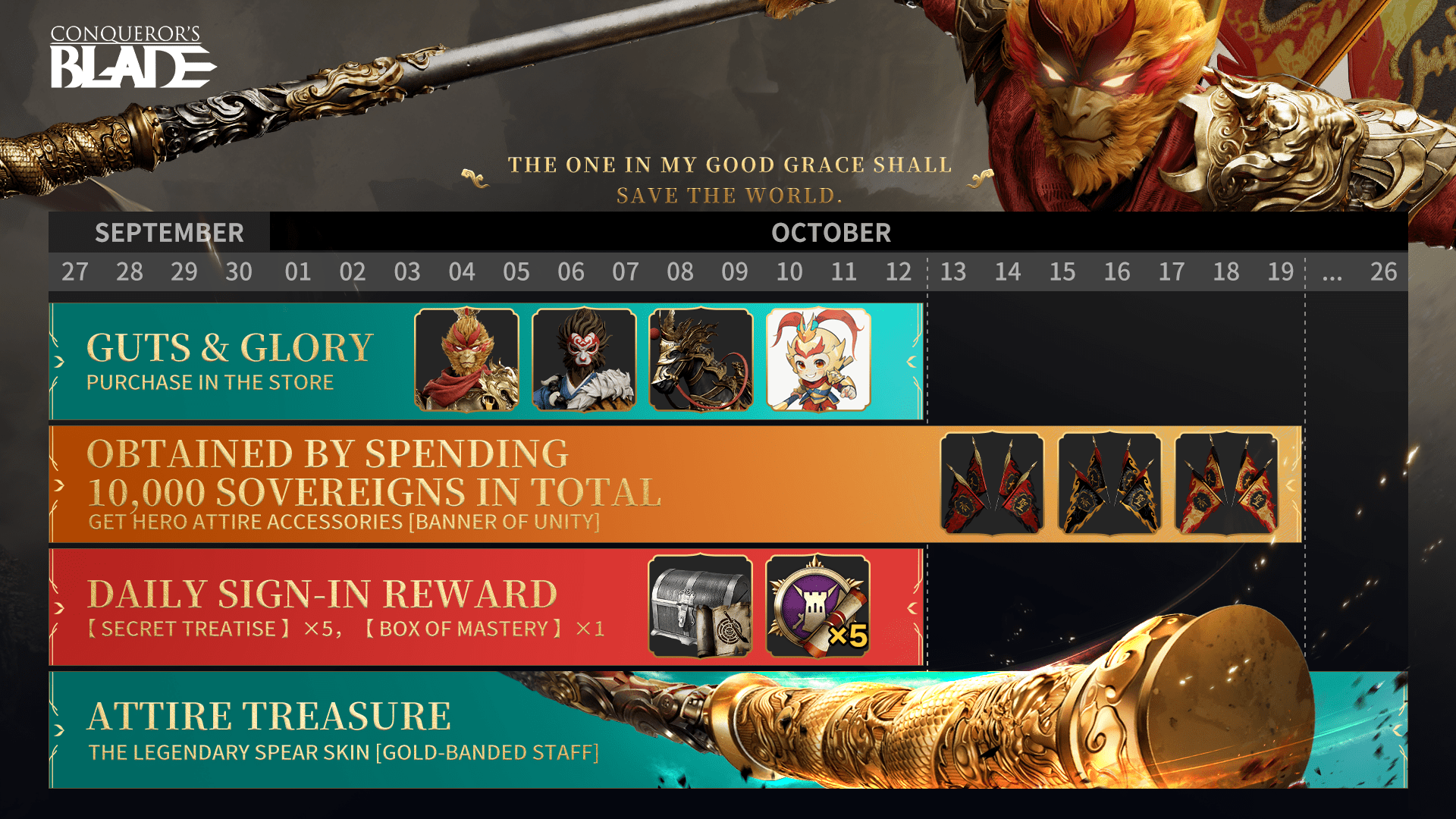 Golden Autumn, Grand Conquerors! Reward Events are coming with [Monkey King] holding [Divine Ocean]! Massive login rewards, brand-new [Guts & Glory] and [Attire Treasure], [Flag Frenzy] with new maps, total spendings events and more all coming together! (You can check the [Golden Autumn, Grand Conquerors] Event Notice for more details on the events.)