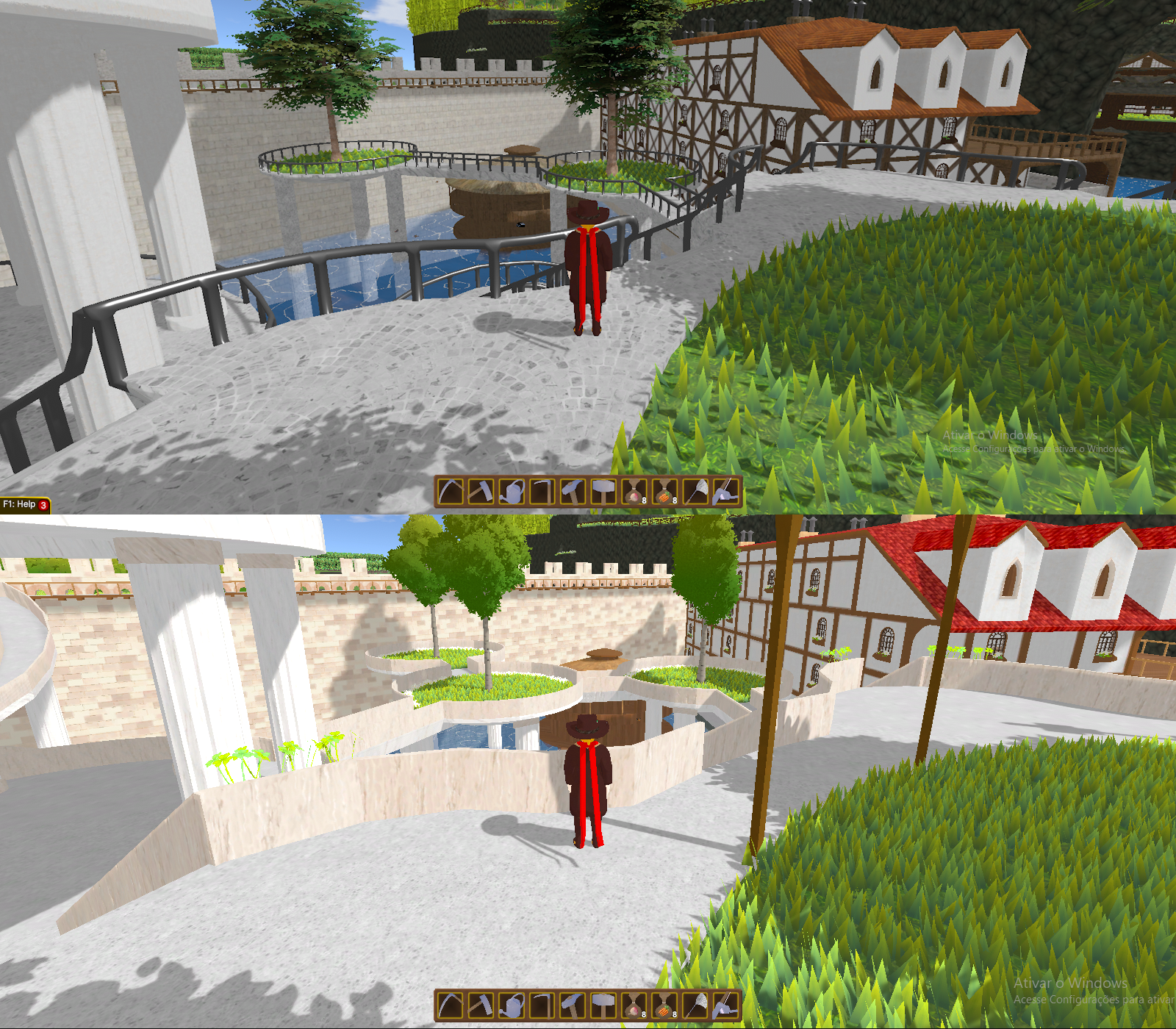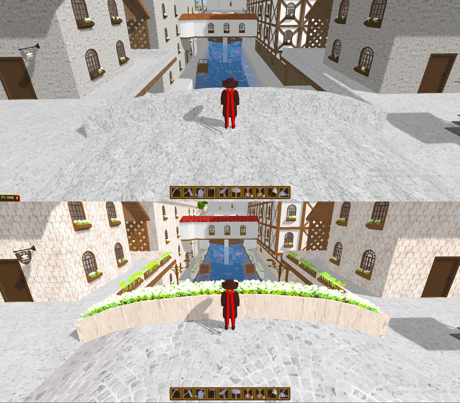 You will notice the many new gardens and pots around the town, some are cultivating clovers instead of flowers, these are placeholder for the vines we couldn't get working yet, we want to have vines climbing the wood structures specially around the shops and have some hanging down the bridges.