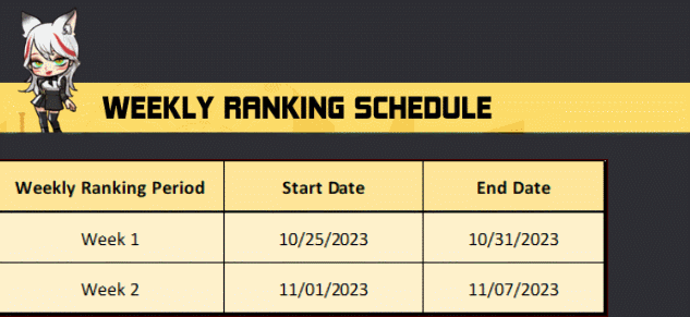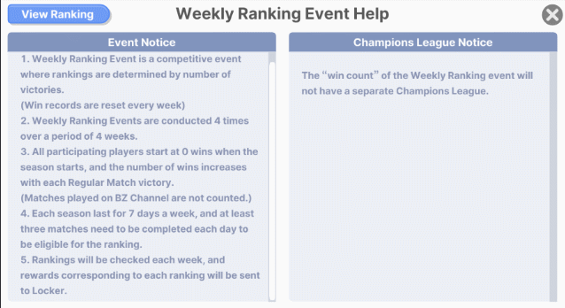 /*NOTE*/ 1. The Weekly Ranking Event will last for 7 days. 2. At least 3 matches need to be completed each day eligible for the ranking. 3. Ranking rewards will be sent to your lock at the end of each we