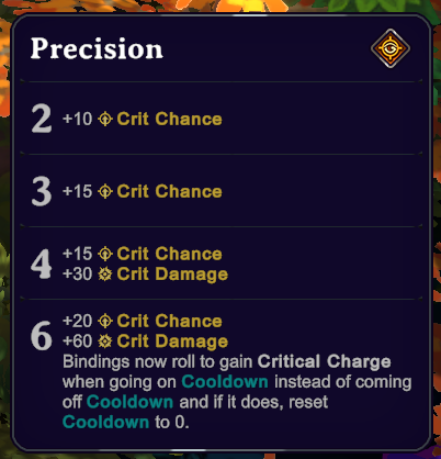 Upon getting two points in Precision, you’ll gain +10 Crit Chance. Upon three points, you’ll get an additional +15 Crit Chance. And so on.