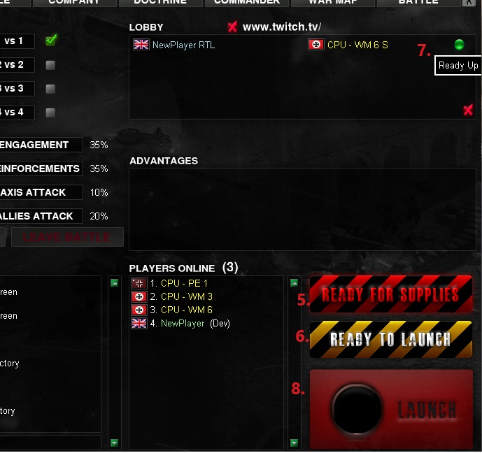 Click ready for supplies, then ready for launch and hit the red launch button next to the AI players to ready them up. After that, the big launch button will light up and you can go set up the game