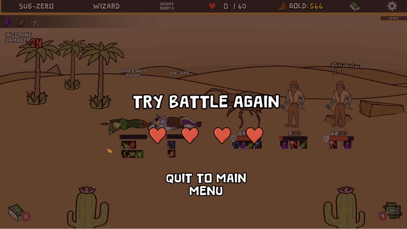 We have changed the battle end animations. Take a look at the gifs on this page! There are 5 new enemies in the Desert and we have updated all of the encounters!