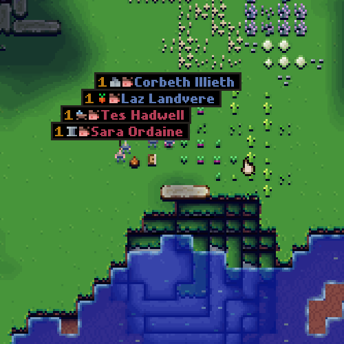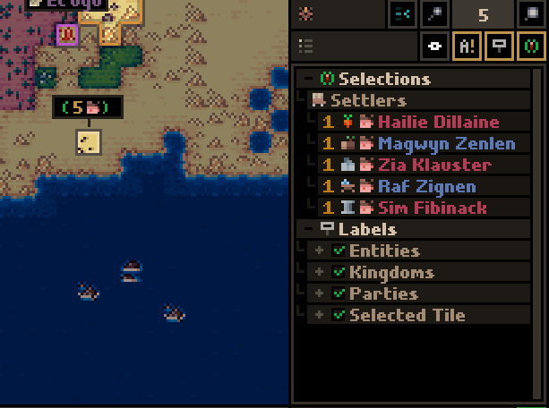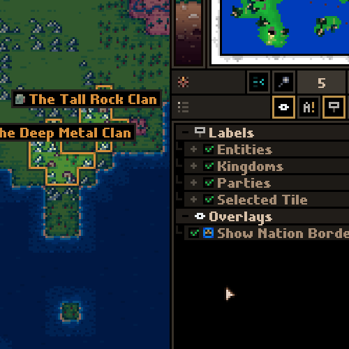 Labels are a new UI feature which detail some of the things in the world, which include: entities, and overworld objects like nations, parties, and tiles. Players can edit each type of label to display specific information. For example, only show the level and profession on an entity label. You can click labels to select the object they represent.