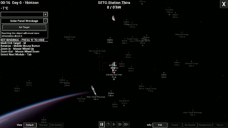 -The deep space scenario now has its own end goal requiring the damaged booster engine to be repaired and an anomaly be explored. -When a VLAR Bot is now shot and destroyed the force from the last shot will be applied properly to the wreckage(usually sending it flying some distance). -Electroshock weapons will now create an electricity visual effect when they hit a target. -Tilting solar panels now appear more damaged when they require repairs instead of just having some missing panels. -Some more improvements to the look of the Earth in various scenarios. -Made the buttons on the EVA port menu slightly more pronounced. -There is now an angle limit for the camera on surface scenarios so it cannot clip into the landscapes. -EVA exterior item HUD tracking will now be hidden when sleeping on the surface scenarios. (since drifting is not allowed) -Completed all functionality to assign physical materials to assets in the future for surface type specific footstep and collision sounds. -Completed all surface type specific footstep and collision sounds. -Improved footstep sounds. Player animations are now synced up with footstep sounds during walking and sprinting. -Enabled slight volumetric fog on the Mars scenario to give the appearance of slight dust in the air. -Improved collisions sounds. -Added more realistic jump sounds. -Fixed an issue with how starships were procedurally spawned on surface scenarios. The problem was caused by an improper rotation. -Made some New Game Menu visual improvements. -The oxygen scrubber menu will now show the current air quality as well as the projected air quality. -The thermal regulator menu will now show the current temperature as well as the projected temperature. -Station windows will now appear to glow from a distance. This makes them visible from longer distances when before they would look too dark.