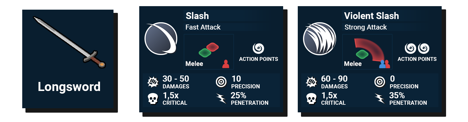 Fast Attacks and Strong Attacks are given by weapons, and they represent the most basic action of most RPGs: using a weapon to attack an enemy. Fast Attacks only cost a single Action Point, allowing a character to move before or after using them. Strong Attacks have more powerful effects but require two Action Points to be used.