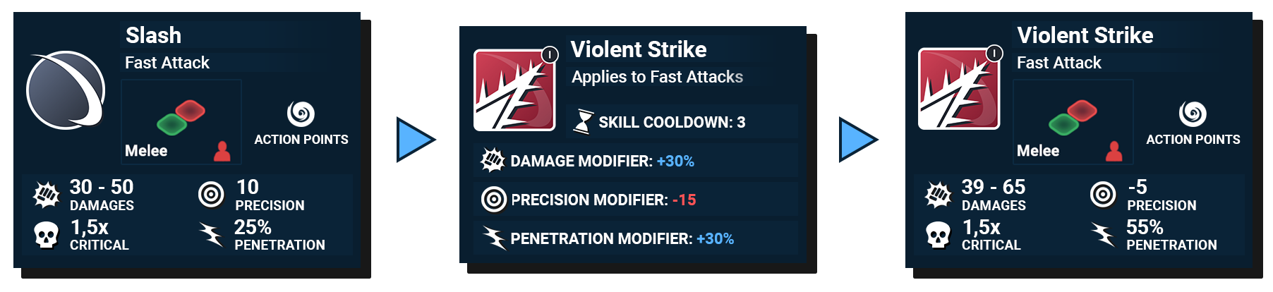 Those two Attacks have their unique stats, influencing how many enemies they can target, how much they can penetrate armor, and how deadly they are. In Dustgrave, you will be able to use those Actions as they are, but our unique twist is that you will also be able to combine the Skills you unlocked with them! This is how a Skill can interact with the sword’s Fast Attack.