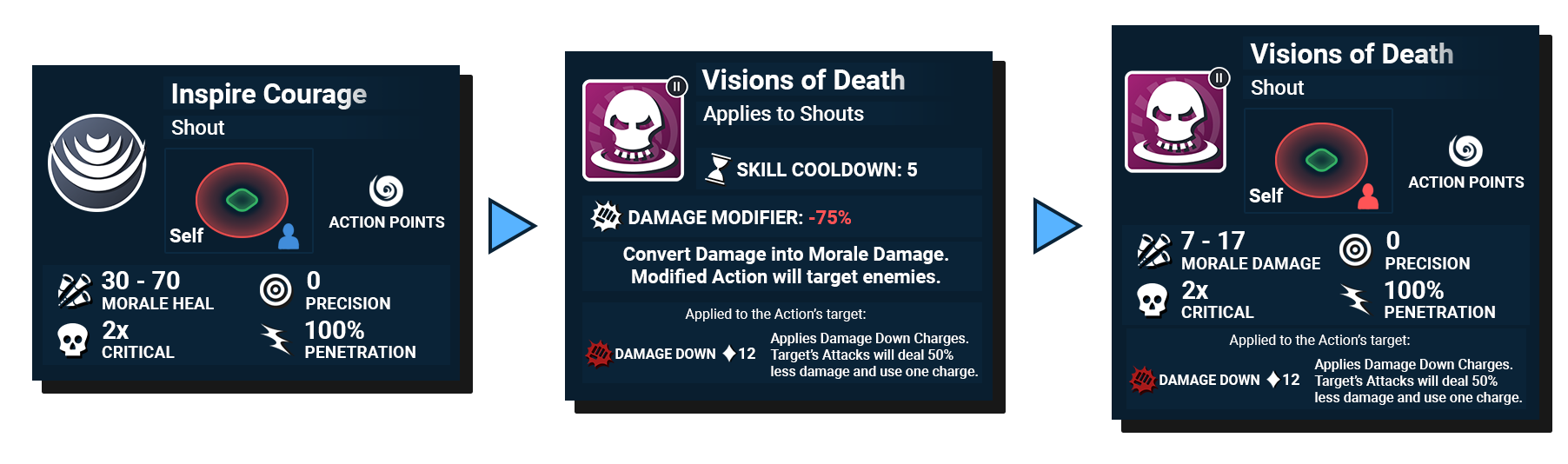 The same concept applies to all other Action Templates. In this case, we have a Skill from the Occult Magic tree, which applies to all Shouts. While the standard Shout applies to allies and bolsters their morale, the modified Action affects enemies and applies a powerful debuff to their offensive capabilities.