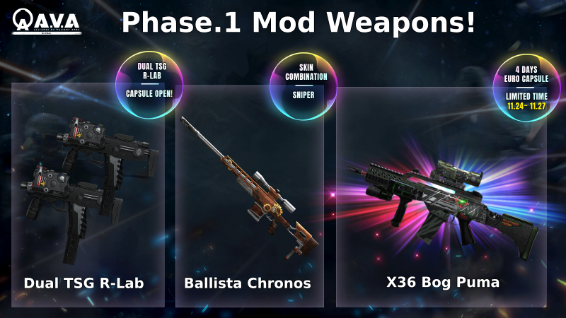 You can obtain Invader Kumari & Dual TSG R-Lab are available in Capsule Shop. Also, Ballista Chronos is available in Skin Combination System. Plus, X16 VN Luvencia is available in Browndust Box (In-game Shop). And, we've prepared a Black Friday Special Mod Weapon Event for all users.
