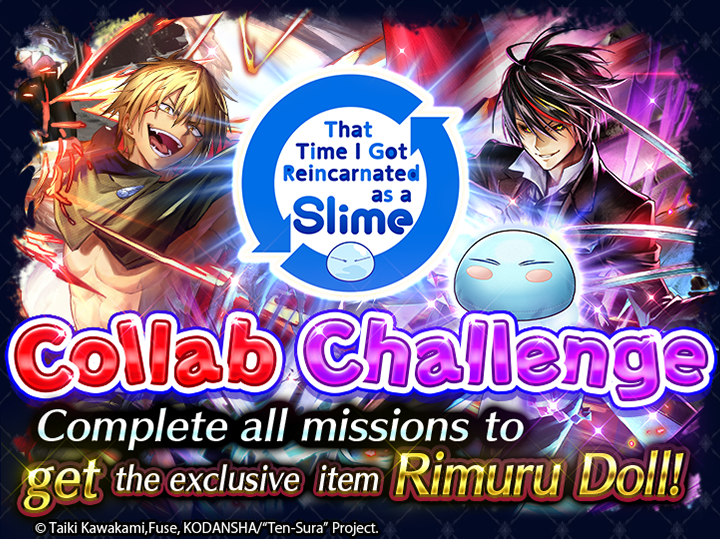 Collab Challenge The Collab Challenge consists of nine simple missions displayed on the home screen. Completing the challenge will reward you with the equipment Rimuru Doll. Earn rewards while getting used to the game!