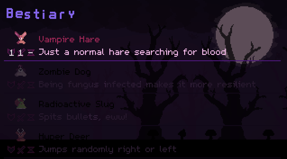 Each time you encounter new beasts you can read a bit about their behavior and stats. Hopefully this will help you overcome the challenging battles!