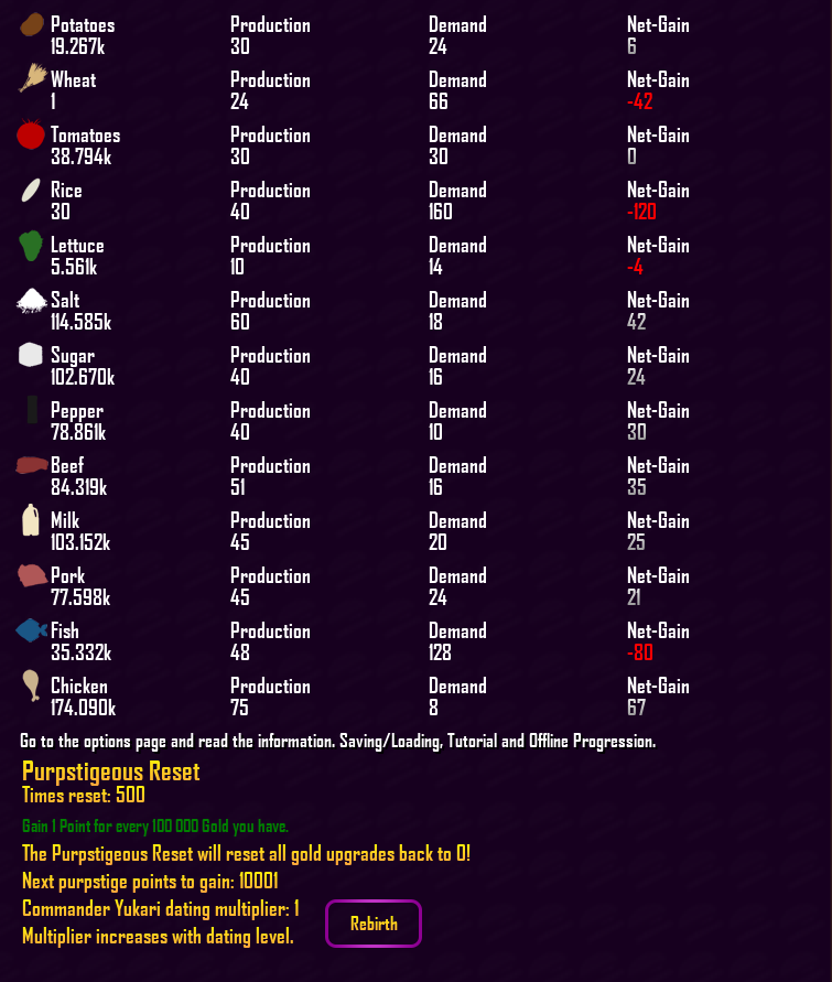 Feeding page: Now displays Production, Demand and Net-Gain. Production is all your total production. Demand is the demand from the kitchens in total. Net-Gain is Production minus Demand. (should be close to 0 to be most efficient)