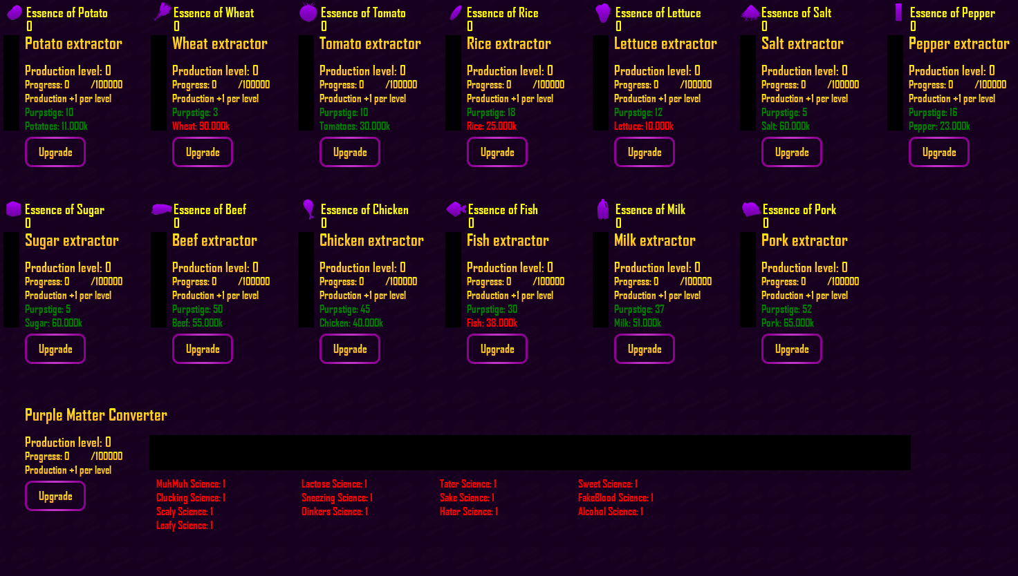 Science Page: The science has been renamed. The previous names were silly placeholders. The science generators are now extractors. The resource itself is now "Essence of ..." The icons and stats have been moved to the science page, as to not cause confusion.