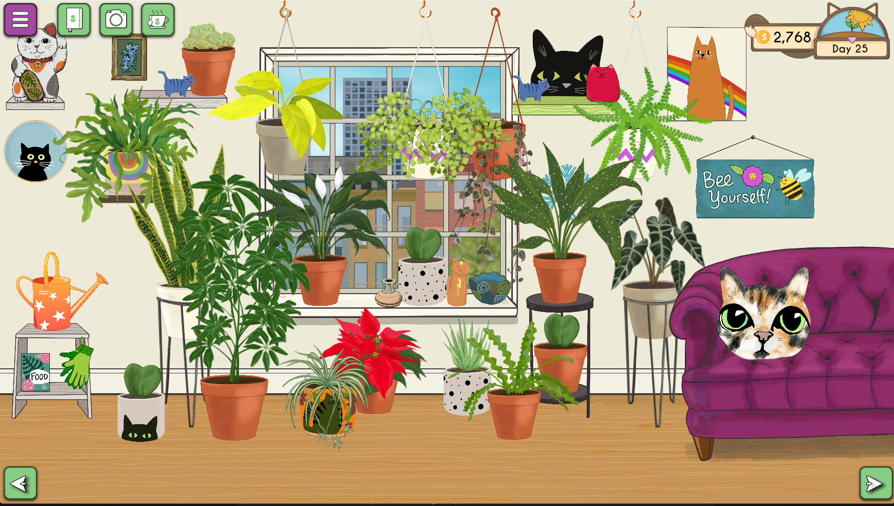 Once your apartment is full of plants and art and curated just the way you like it, you can sit back and relax in COZY MODE. Activate on the pause screen and enjoy your plants without the fuss of coins or watering or fertilizing. Time will still pass and you can use your gloves to move items around. Click on the tea cup button to turn it off.