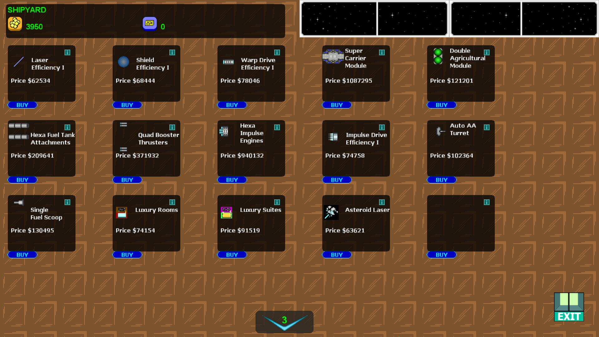 Seen here are the three added ship upgrades. The luxury rooms and luxury suites reduces morale depletion rate. The asteroid laser will increase the chance of finding resources in asteroids as they are shot and break apart.