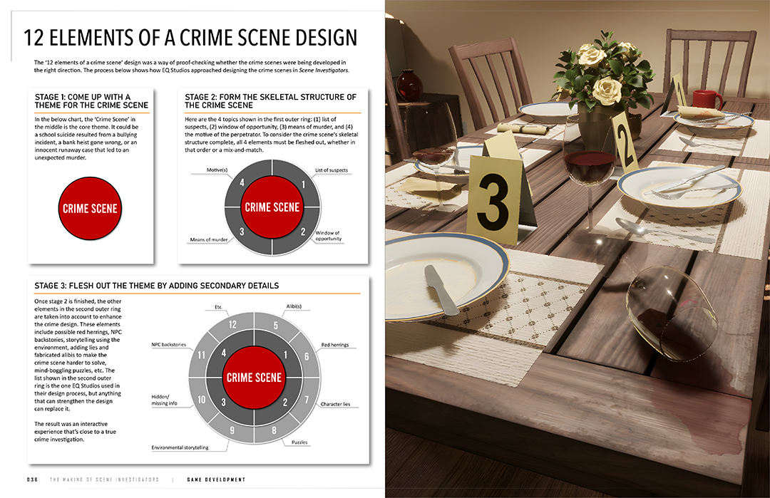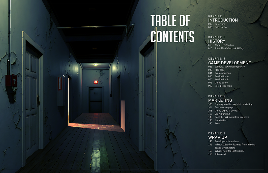 The Making of Scene Investigators is a 160-page digital book that delves into the process of how Scene Investigators was created from inception to completion. It includes the history of EQ Studios, ideation phase, different stages of game production, post-game development, music making, marketing and more.