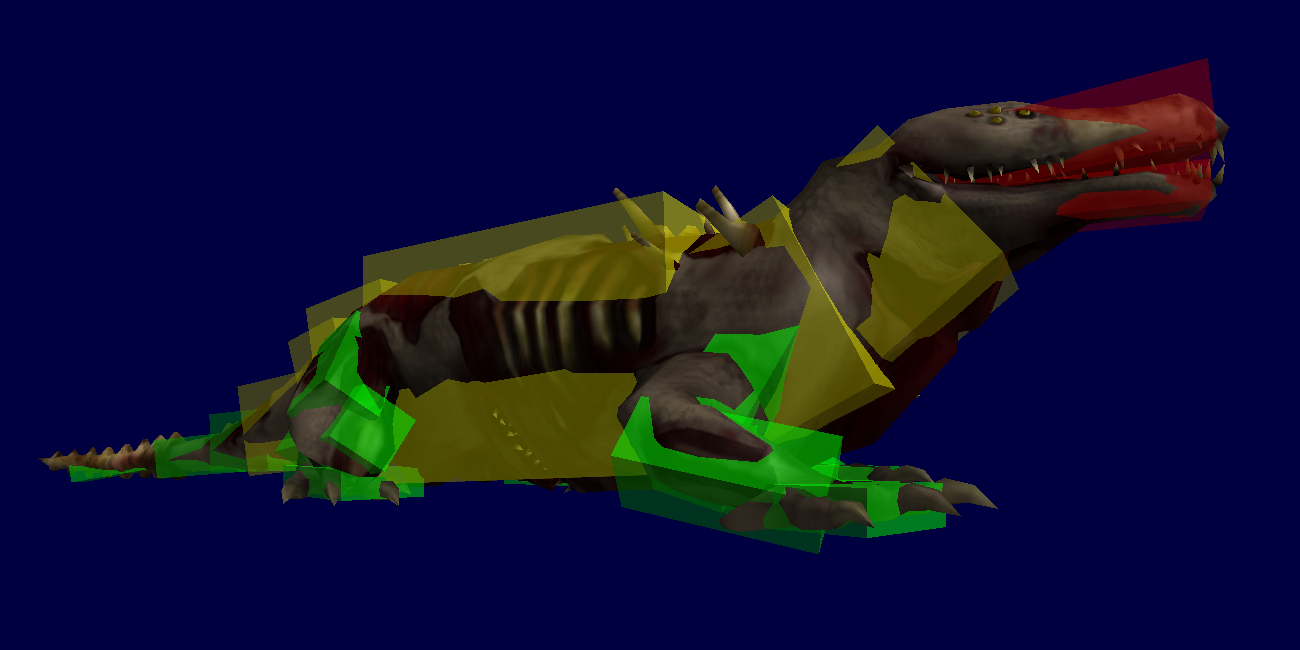 Short explanation: The green hitboxes are used for the lowest amount of damage dealt to an NPC, designed to be used for arms, legs or tails, like in 682’s case. Yellow hitboxes are used for the body in general, they deal medium damage to an NPC. The red ones are critical hitboxes, primarily used for headshots or anything else that would do a lot of damage on an NPC. For 682’s case it’s only the head and his large jaw.