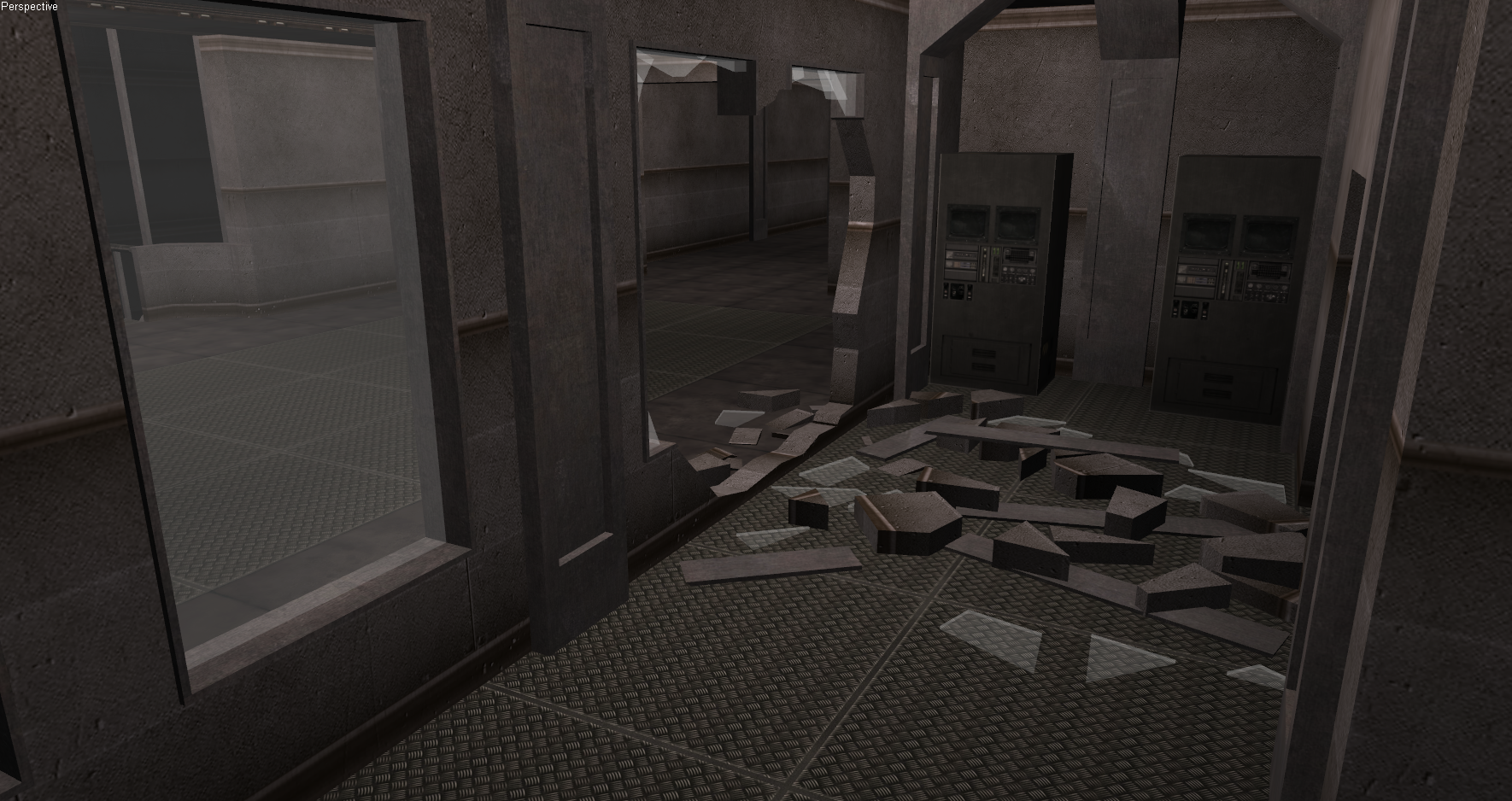 The screenshots above show an area which has been destroyed by SCP-682. Each piece was modeled completely intact onto the wall itself and then broken up and scattered on the floor, in order to make it as realistic as possible.