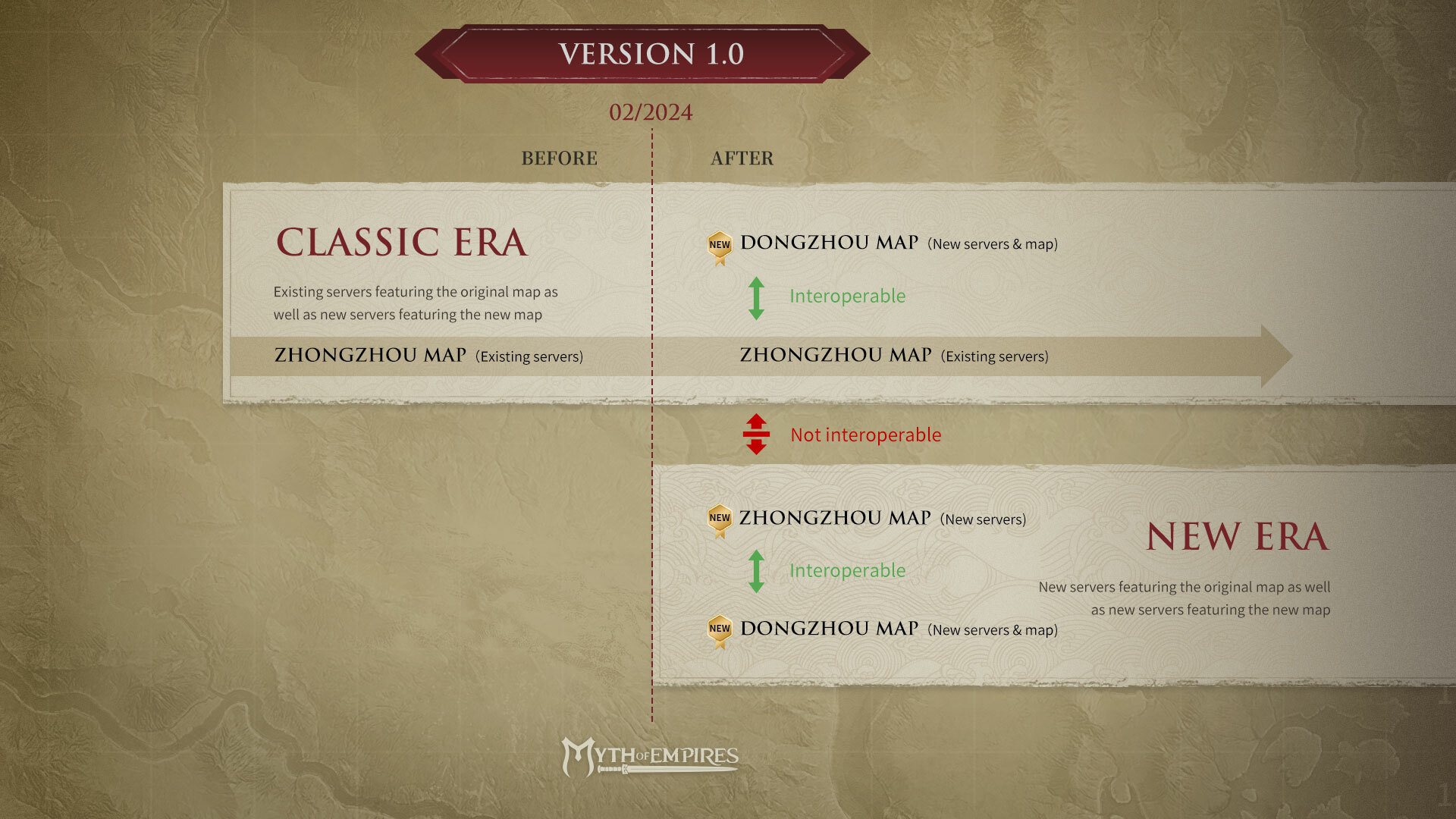 1. Server interoperability. Myth of Empires Version 1.0 will have two server groups: Classic Era Servers and New Era Servers. Classic Era Servers cover servers that already exist. The data on these will not be deleted. Servers with the new map will be added to this server group, and will be interoperable with the old servers. New Era Servers will feature all brand-new servers featuring the old map, as well as new servers featuring the new map, which will be interoperable with one another. Classic Era Servers and New Era Servers are not interoperable (see the figure below). These changes will all be implemented upon the Version 1.0 release.