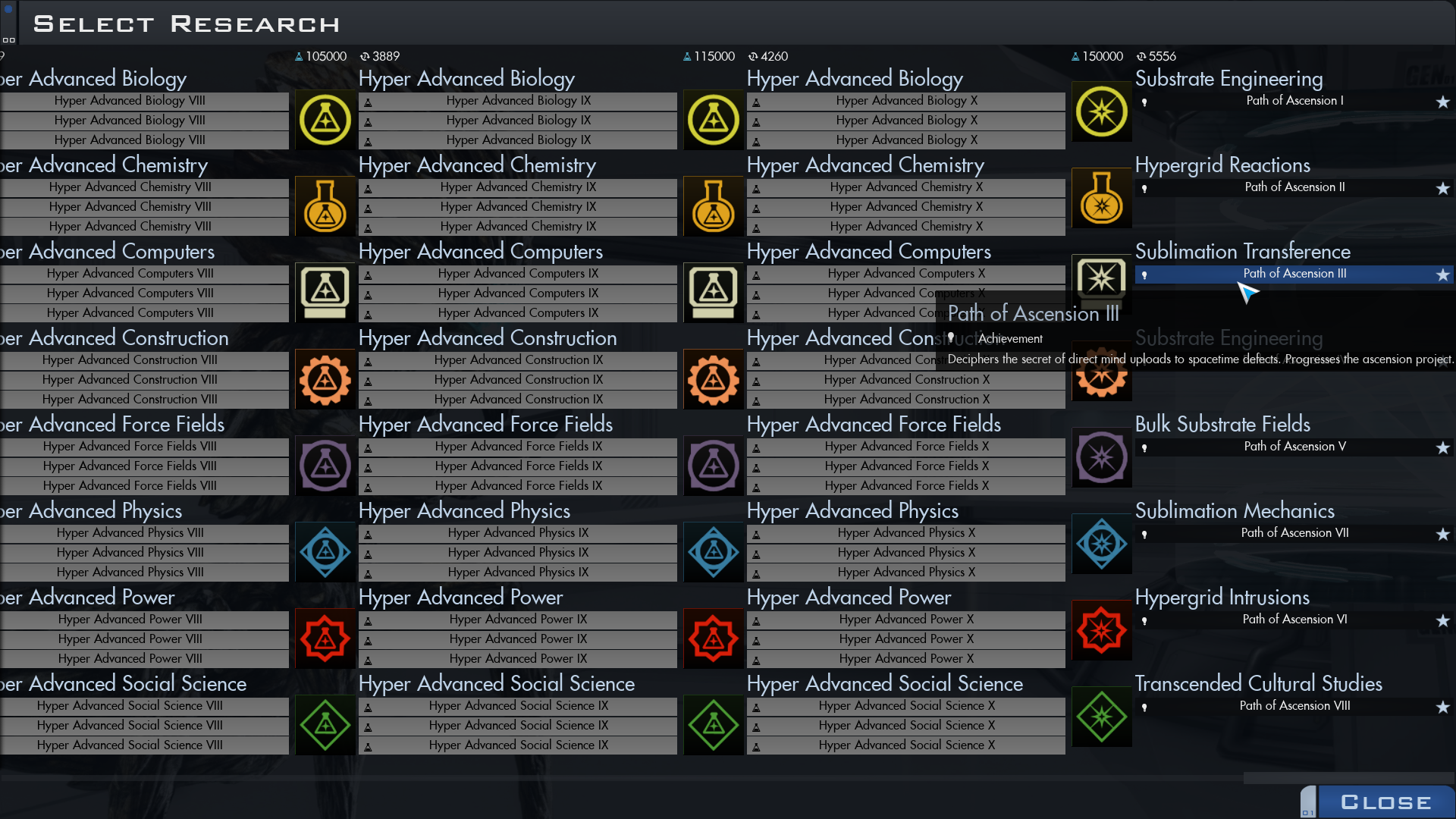 Research victories involve unlocking all of the path to ascension technologies and constructing a super project for ascension on your homeworld. Image 1. Ascension technologies.