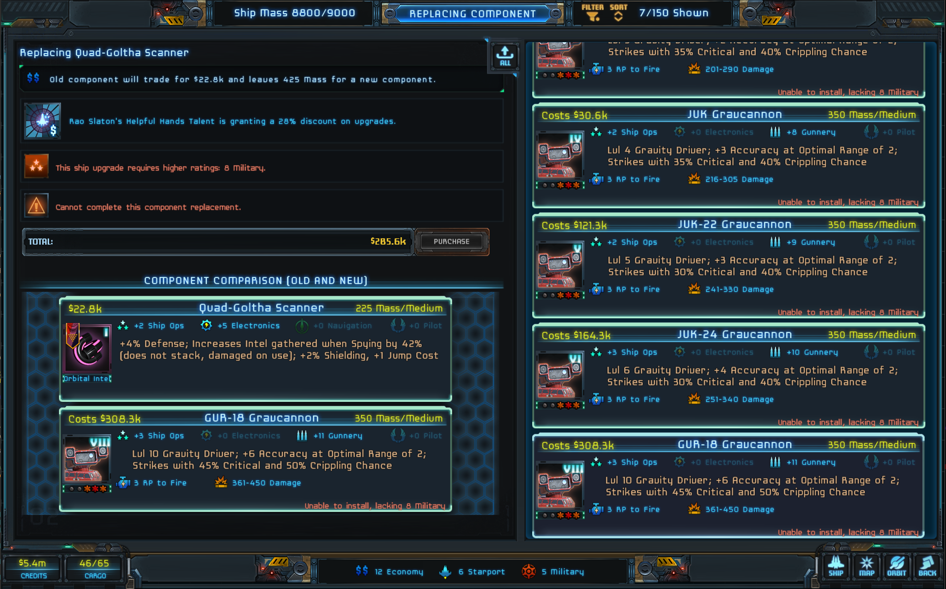 The first medium slot Gravcannon above level 6, the GUR-18 weighs in at level 8, costing 3 AP to fire and smacking with a massive 360-450 Dmg. While it can't boast best in class for its other weapon statistics, it is still a smaller, faster Gravcannon (is there such a thing?) that can still shatter enemy hulls and may fit better into your ship configuration than one of the larger high level GCs.