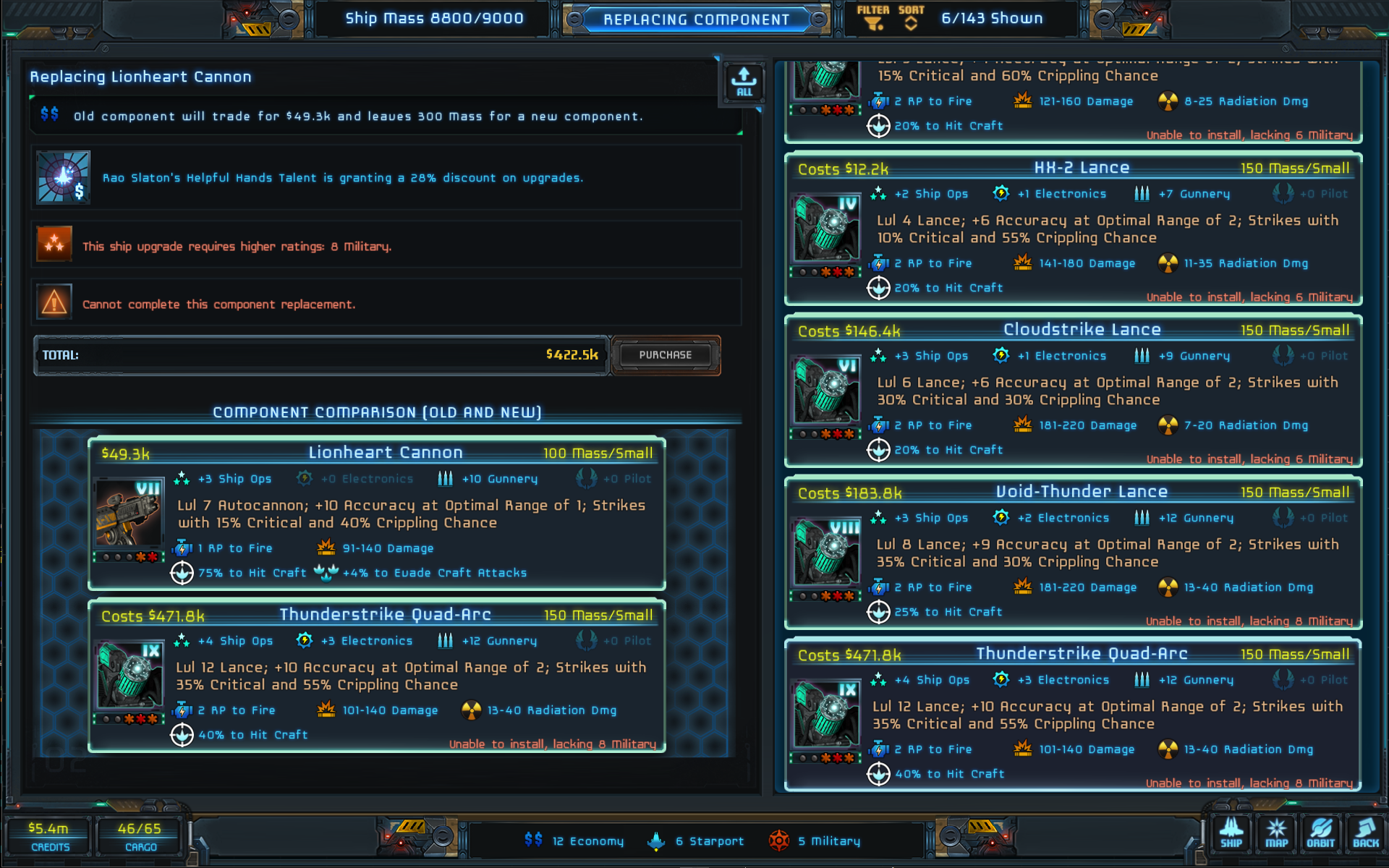 - Added new "GUR-18 Gravcannon" (Level 8, Size 2) - Added new "Thunderstrike Quad-Arc" (Level 9, Size 1) - Rebalanced Lance Ship Weapons, now classified like Autocannons, Gravcannons - Minor balance adjustments for Torpedo Mk3-Delta, Torpedo Mk4-Ultra - Retrained AI Lance strategy with new improvements - Spice Hall with low HP now increases the chance of Spice Addict Trait rolling - Increased Price Duranium Coating II, Duranium Coating III and made them more rare - Increased Price of Level 6+ Autocannons, GravCannons and Lances and made them more rare - Exploration on Molten Worlds has higher chance of generating Crew damage
