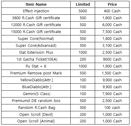 3) Happy Hour event(When you stay at the server at this time, you will get rewards) - 18:30 : Super Core(Advanced) - 19:30 : 1000 R.Cash Gift certificate - 20:30 : 1st Gacha Ticket(1EA)