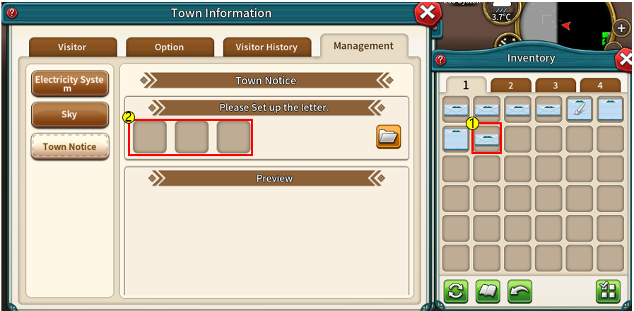 Private Area -> Managemaent -> Town Notice Write what you want your visitors to know on the letter and insert it into the slot. (However, you can only insert a letter if you've saved and published it)