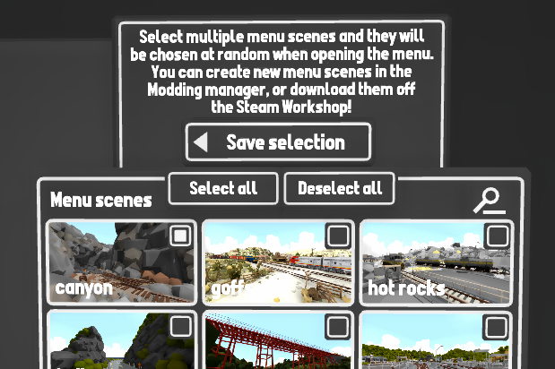 You can select as many different menu scenes as you want, and essentially make a shuffle list of different menus for the game to use each time it loads. These menus are literally just normal save files, which means they can contain everything from moving trains to mods and even custom audio!