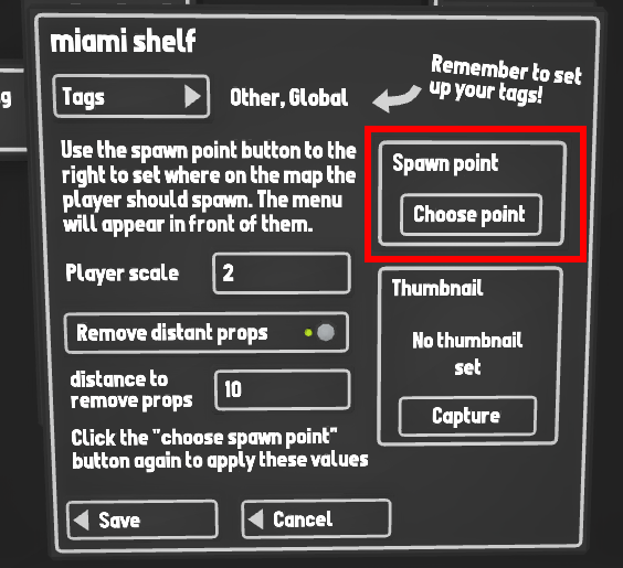 From here, you can choose the location where the player spawns and even set the size of the player, so you can make the player larger than they are usually in miniature mode.