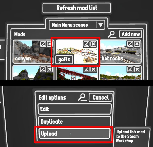 You can also upload your custom menu scenes to the workshop! In the modding manager, simply click on your menu scene and choose "upload" from the popup list: