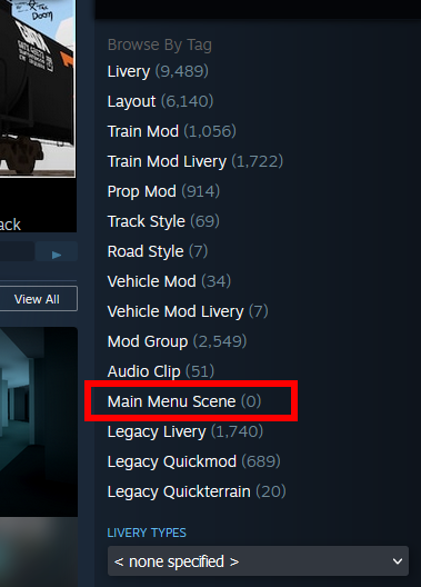 You can then find other people's main menu scene uploads in the "main menu scene" tag category on the Steam Workshop:
