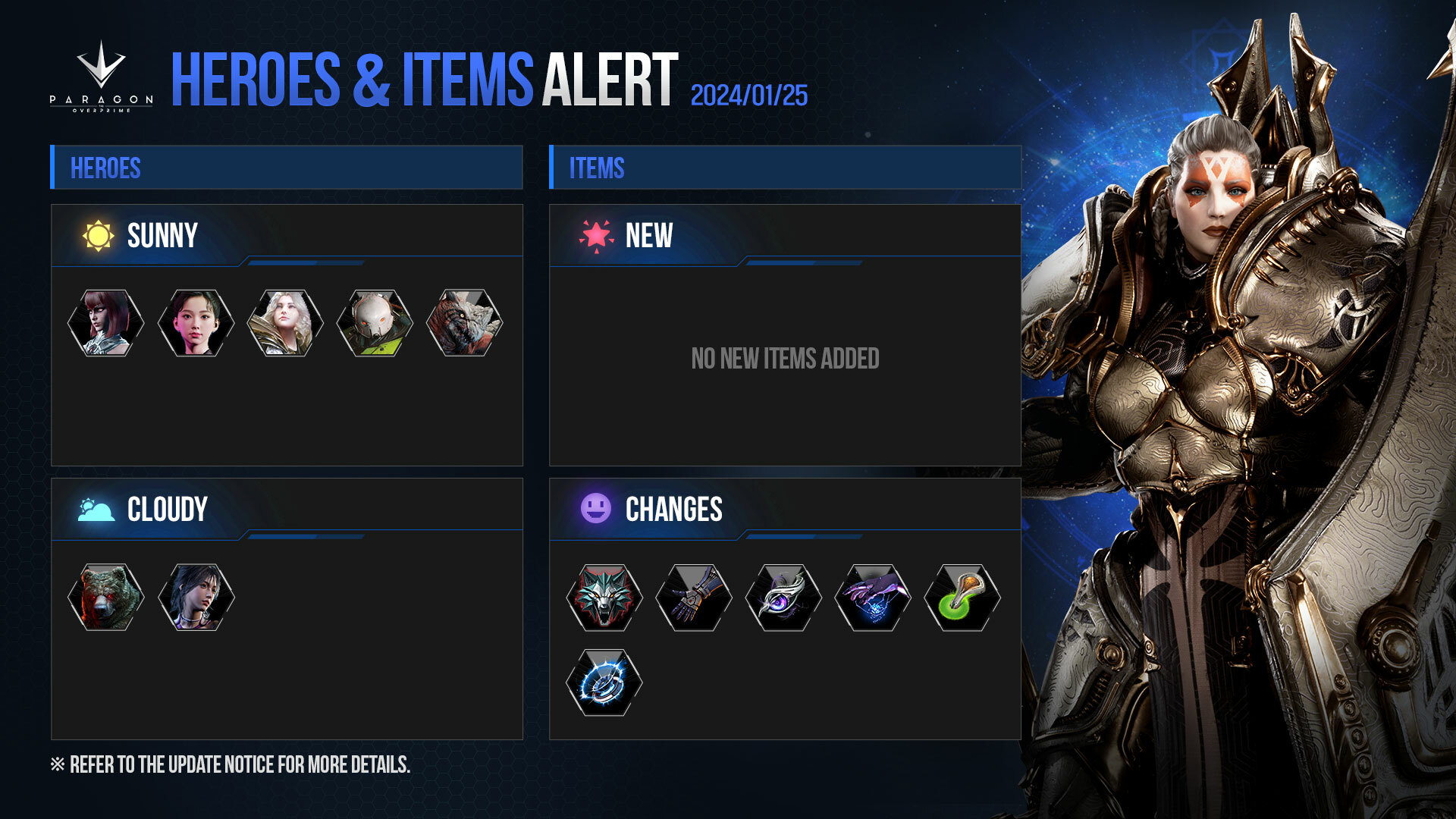 [Others] - Improvements have been made so that when you select an item in the Shop, you will be taken to the item's detailed information page. - A separate purchase guide popup message will be displayed when the purchase button is clicked in the Shop. - The animation of the skill icon has been improved to make it easier to tell when a skill has been acquired. - The animation and sound of the game results screen will be improved. - The animation displayed when opening the [Emote] - [Equip] menu will be improved. - A slow-motion setting (x0.5) will be added in the Replay Match. - Partially changed the wording of the popup message that appears during Kima purchase errors. - The message displayed when no items match the criteria (No items match the search criteria) will have a toned-down color when searching in [Lobby] - [Shop]. - Made changes so that Teleportation and Swift Charge Karma can't be used while certain skills are in use. - The Displacement Blast (Q-Skill) pulse bullet of the hero "GRIM.exe" has been improved to be fired in the actual targeted path. (Added on 1/26)
