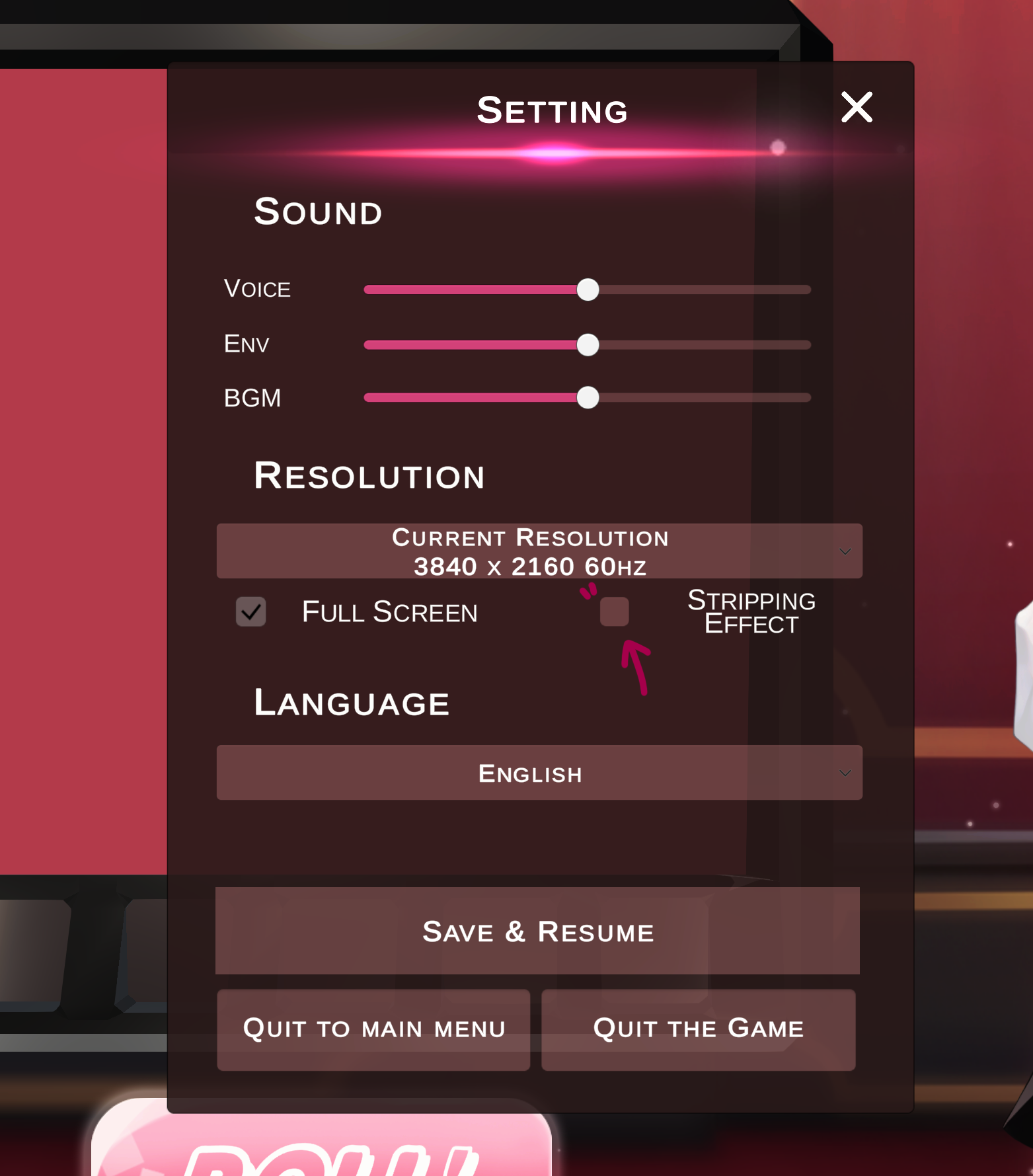 Please disable the stripping effect in the settings window while the game is in progress. It only appears on the game screen. I can't find it anywhere else, such as on the main screen.