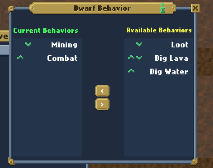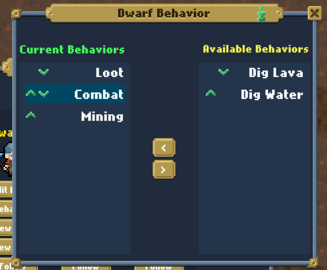 I've noticed some users not finding out how to change Dwarf behaviors as a new player. I want to change that. Behaviors has been taken out of "View Stats" and put within the Dwarves Window. The idea is to assign your wanted behaviors to a Dwarf. For example, if I assign Mining first and Combat second; if there's nothing else to mine the Dwarf will then change their behavior to Combat. Top is highest priority whilst bottom is lowest priority. This will make it so your Dwarves are ALWAYS active depending on the behaviors you give them.