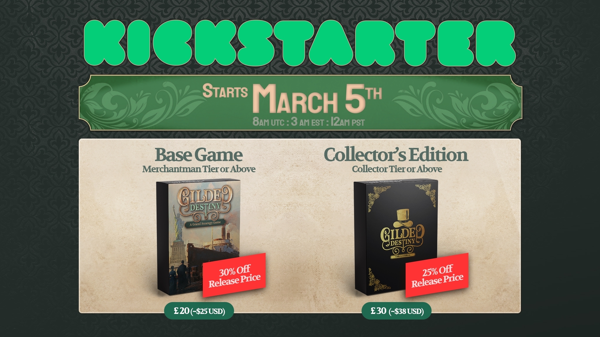 We are excited to announce that the Gilded Destiny Kickstarter is launching in two weeks on March 5, 2024 at 08:00 UTC! (That is 12:00am PST, 3:00am EST, 09:00 CET)
