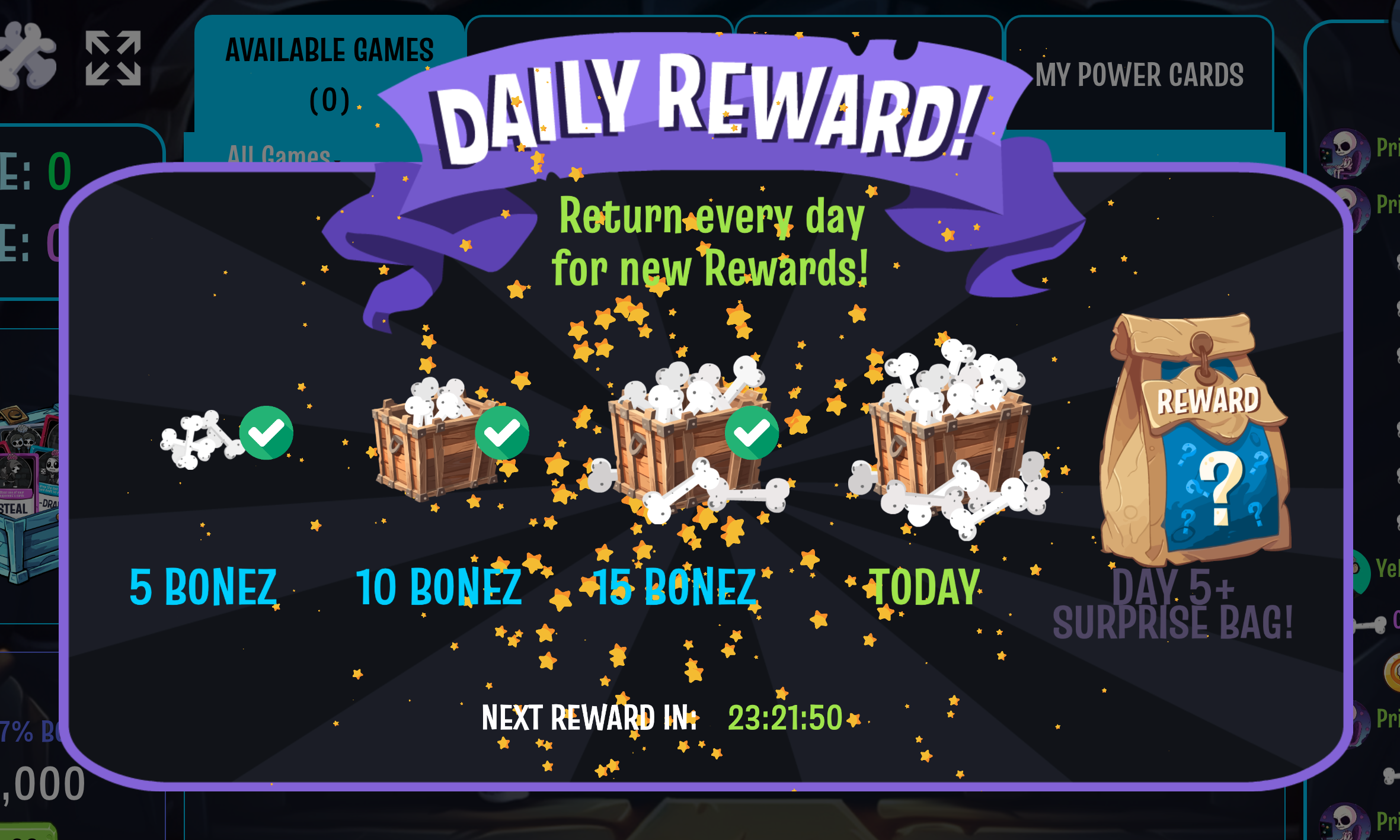 Our goal with this feature was to add an extra layer of excitement to the gameplay experience, rewarding player dedication and commitment. Players can win Bonez and power cards with each daily reward. The randomness we have programmed into the prize payouts means that each time a player returns, they will receive a different prize.