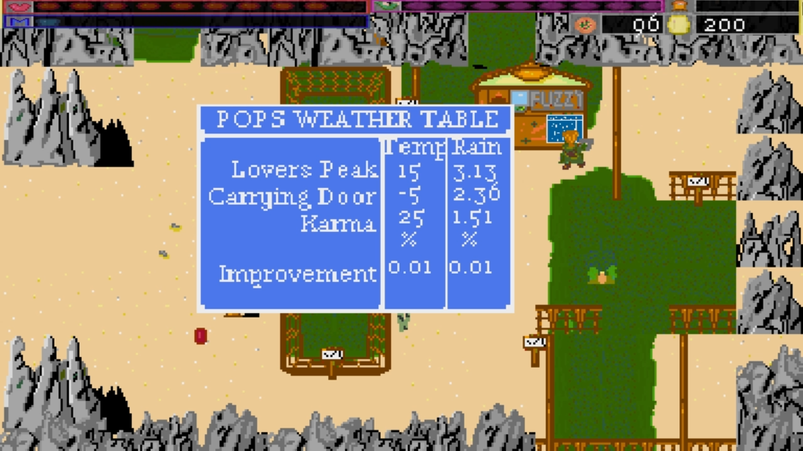 These temperatures in all zones are affectable by how you play. The temperature and amount of wind and rain/thunder in turn depend on how much wildlife you kill and how many seeds you plant or can be connected to quests in the numerous towns. The whole world's climate and people's lives are affected by what you and others do in the world. This in turn affects the growth rate of all things growing, the world is very reactive.