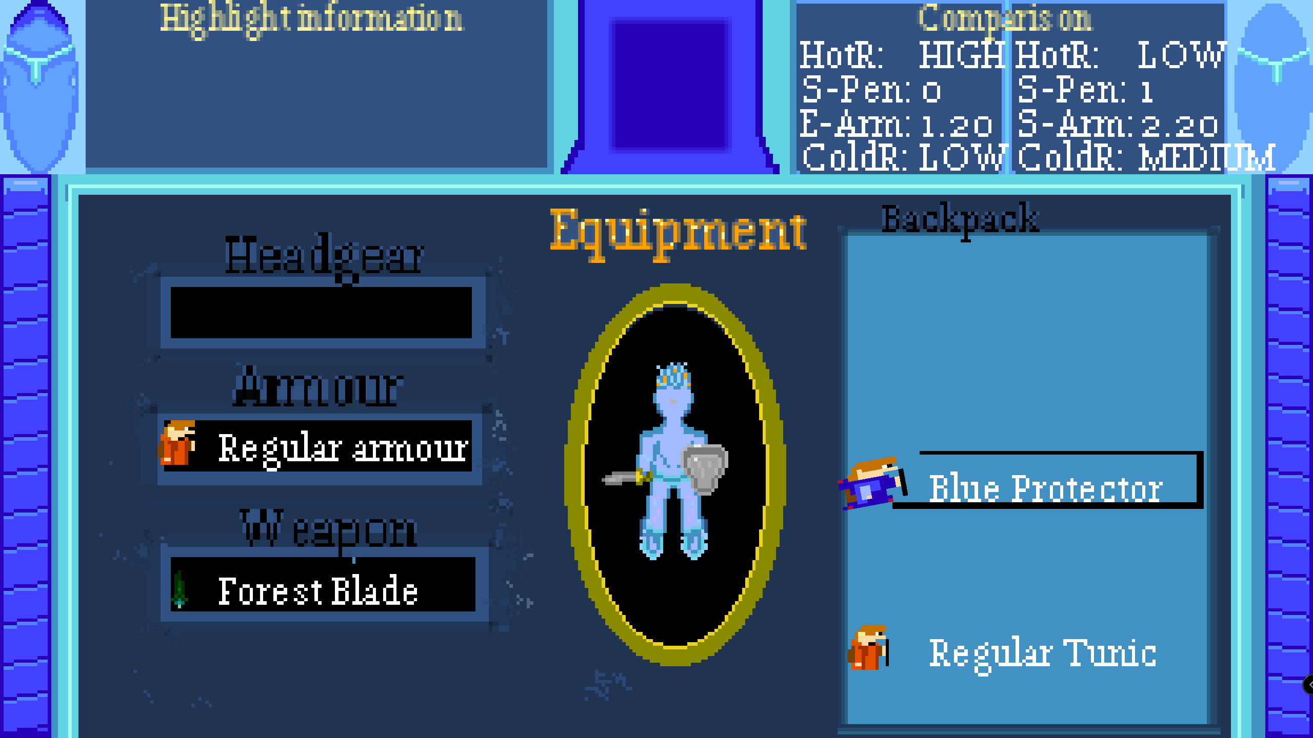 Here you see there are 25 degrees in Karma Village which is in the HOT temperate zone. If you were to switch to the nice new beautiful Blue Protector Armor you found shown below. It would have a low hot resistance which means even in only 25 degrees you would overheat after a while and be having to bring enormous amounts of water. When you overheat you can also catch bugs and diseases that affect you in various ways.