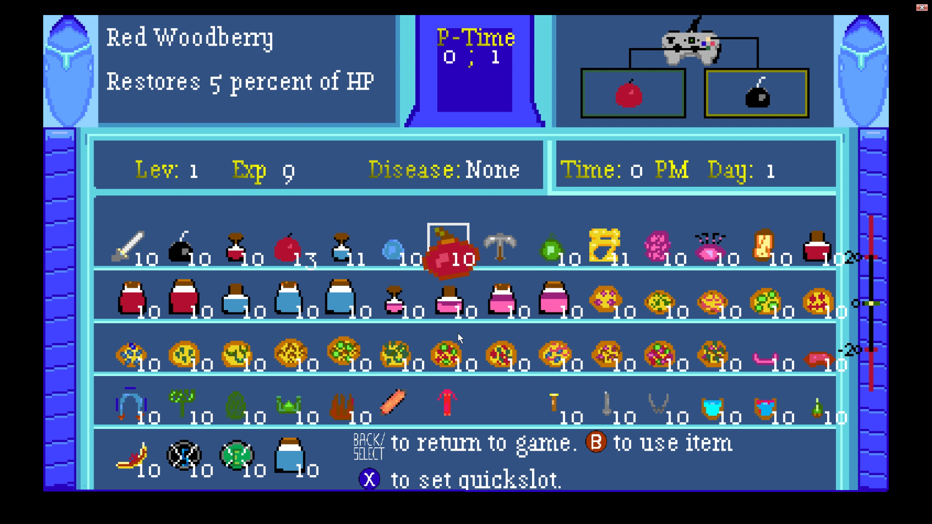 Below is a picture of the first inventory page. In the top right corner are quick slots where a lot of items are selectable. You can choose to stack heal items activated by the buttons. Or different kinds of bombs you crafted or special items like hooks and the infamous axe to break rocks and find secrets and new paths in the world. The game is full with secrets and hidden lore begging to be explored.