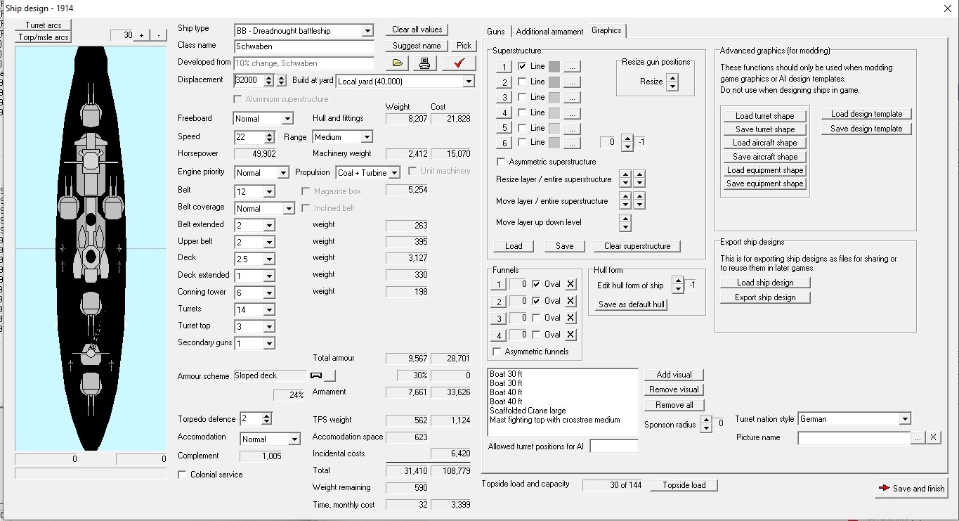 Ship DesignAdded an export/import function for ship designs. The export function for ship designs is located on the graphics tab in the ship design screen. It will let you export any ship design as a file. The design can then be shared with other players or reused in a later game. Exported ship designs are located in the folder "My Games\Rule the Waves 3\Save\Ship Designs". Moved the auto carrier conversion button to the box for flight installations. Added a function to auto change carrier graphics to angled flight deck. Curbed the tendency of the AI designer to overuse triple turrets on ships. Fixed a problem with rebuilding ships transferred from other nations. Fixed a problem with multiple classes being generated when fire control is upgraded for ships under construction. Further adjustments to secondary gun placement on cruisers and destroyers. Improved the autodesigner to avoid illegal triple turrets in A or Y position. The upgrade guns button will now be available when opening an existing design that has worse gun quality than available. Adjusted the automatic secondary gun placement on cruisers to avoid having them placed outside the hull. (It is better but not perfect) Using auto design in the design screen will now force a different template. Improved the British name list to produce more appropriate ship names from the 1920s. Prevented fitting V turret on ships that couldn't have X turret. Fixed a bug with the gun quality of the rebuilding nation not being taken into account for gun upgrades. Fixed a bug with the autodesigner sometimes building ship with AON armor when it isn't researched. Fixed a bug with ammunition weight calculation in the 80-85 rounds per gun interval. Fixed a bug where a CA could have protected cruiser armour configuration.