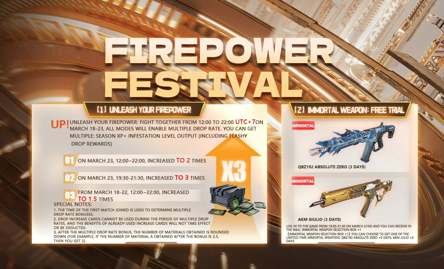 ■ From March 18th to 22nd, between 12:00 and 22:00, all game modes will feature increased drop rates, enhancing both 'Infestation' rewards (including flashy drop) and seasonal XP gains by 1.5 times.