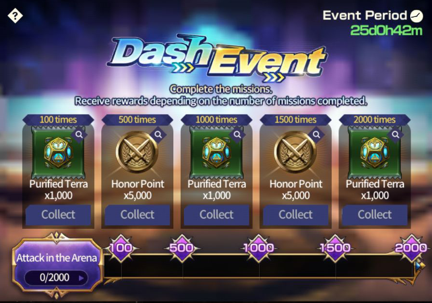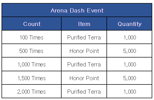 [Arena Dash Event] ■ Event Period: Mar 14th Update - Apr 11th Update 2024 ■ Details: Receive rewards depending on the number of Arena participation during the event period. ■ Missions and Rewards