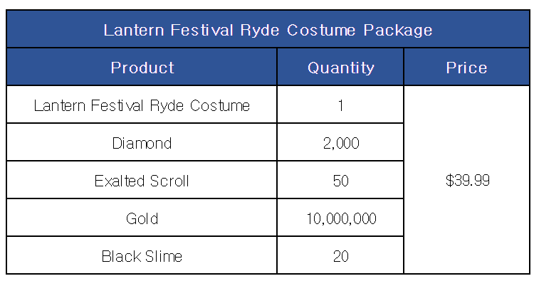 [Lantern Festival Ryde Costume Package] ■ Sale Period: Mar 14th Update - Apr 11th Update 2024 (UTC). ■ Products and Price ※ This package can be purchased up to once per account.