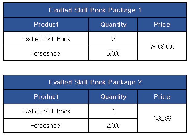 [Exalted Skill Book Package] ■ Sale Period: Mar 14th Update - Apr 11th Update 2024 (UTC). ■ Products and Price ※ This package can be purchased up to 3 times per account.