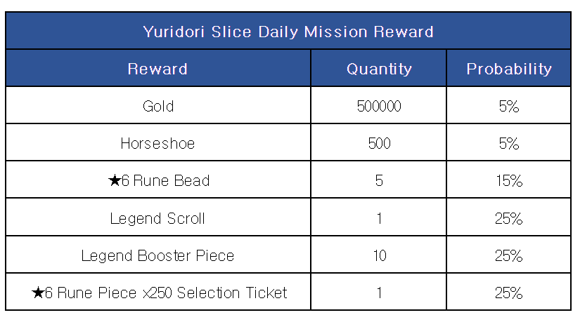 While the Mini Game Yuridori Slice is available, a new daily mission 'Play Yuridori Slice' will be added. ■ Daily Mission Reward