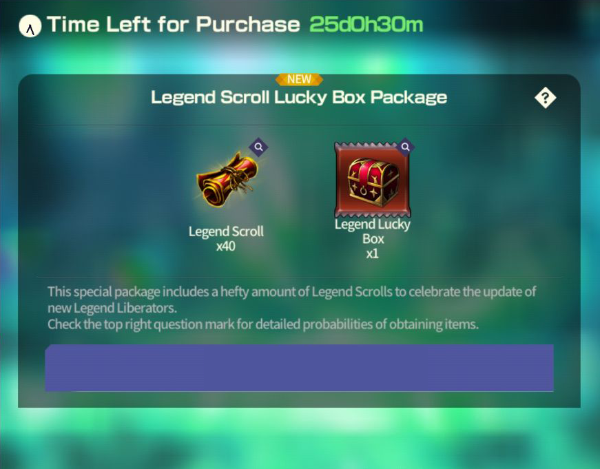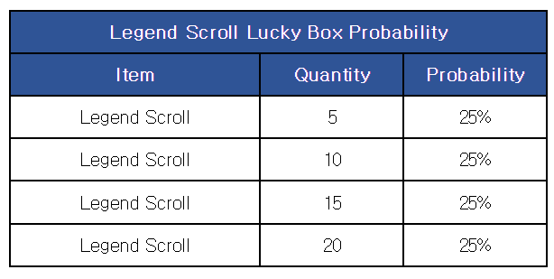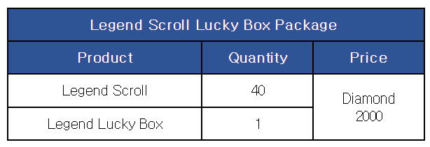 [Legend Scroll Lucky Box Package] ■ Sale Period: Mar 14th Update - Apr 11th Update 2024 (UTC). ■ Products and Price ■ Legend Lucky Box Content and Probability ※ This package can be purchased up to 10 times per account.