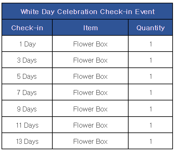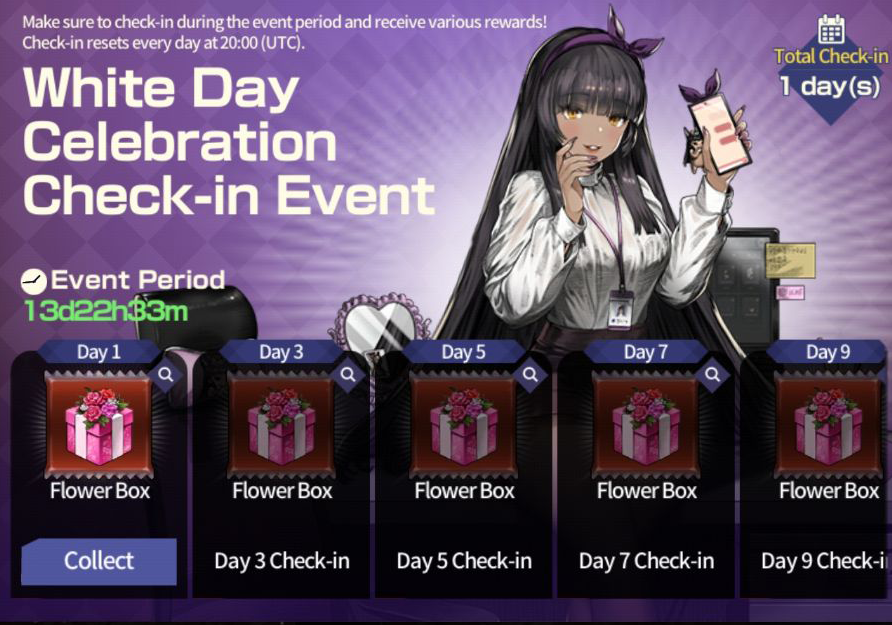 [White Day Check-in Event] ■ Event Period: Mar 14th Update - 19;59 Mar 27th 2024 (UTC). ■ Participation Period: Event can be participated in for 14 days after the first log-in during the event period. ■ Details: Log-in during the event period to claim rewards depending on the number of days checked in. ※ [Collect] button must be pressed to claim the event rewards. Each of the event rewards can be claimed once. ※ Check-in records are refreshed every day at 20:00 (UTC).