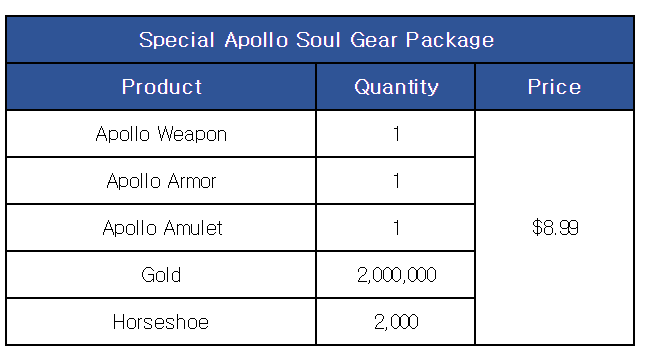 [Special Apollo Soul Gear Package] ■ Sale Period: Mar 14th Update - Apr 11th Update 2024 (UTC). ■ Products and Price ※ This package can be purchased up to once per account.