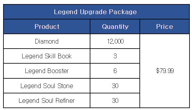 [Legend Upgrade Package] ■ Sale Period: Mar 14th Update - Apr 11th Update 2024 (UTC). ■ Products and Price ※ This package can be purchased up to 5 times per account.